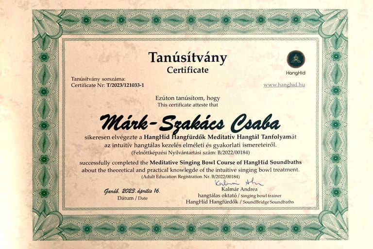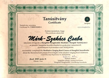 Csaba’s background includes training in sound therapy practices, ongoing education, and practical experience in both individual and group settings. His approach is informed by research on sound perception and nervous system regulation, combined with real-world application.