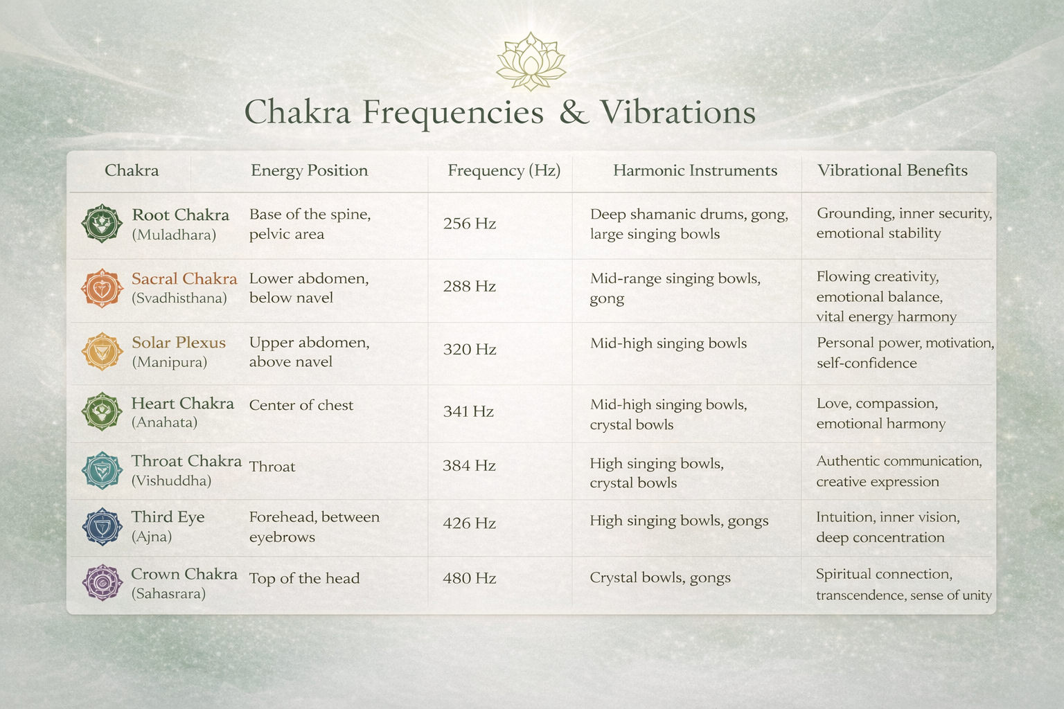 Chakras & energy flow: Frequencies corresponding to chakras support body-energy alignment, increasing inner balance and mind-body regeneration