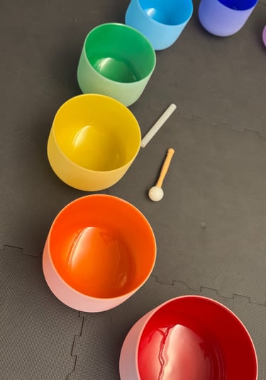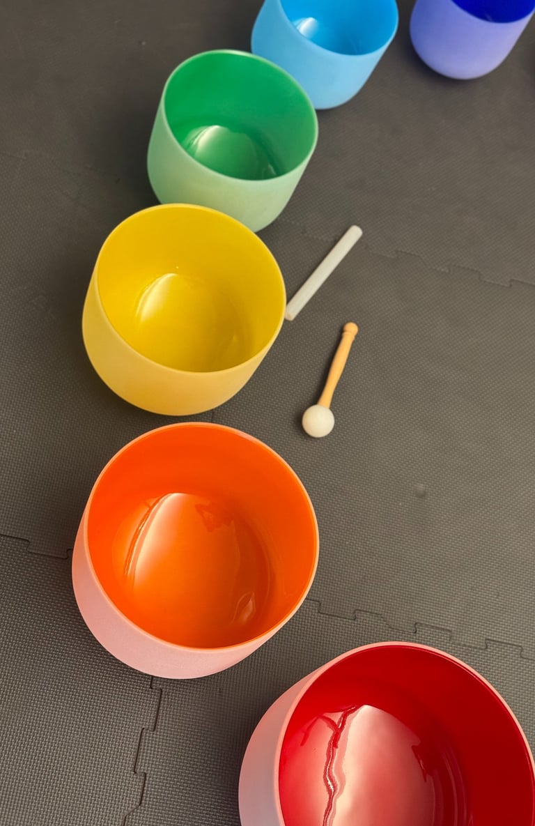 Bowls tuned to the chakra frequencies are placed directly on the body. The vibrations are felt at the cellular level, stimulating the body, nervous system, and energy system simultaneously. Using these frequencies, I cleanse, energize, close, and harmonize the chakras, promoting balance of body and mind.